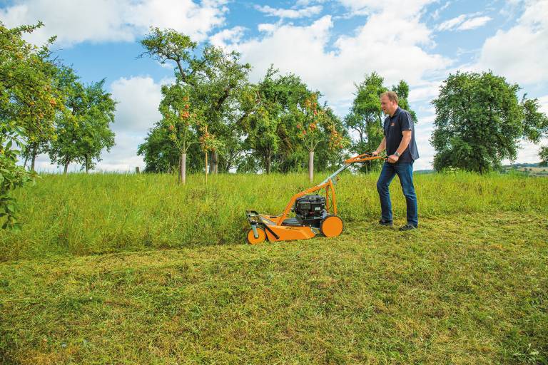 Extensively used meadows such as orchards, compensation areas, or roadside greenery are deliberately mowed only once or twice a year. The vegetation reaches heights of 60 to over 100 cm and forms dense, structurally rich stands. This form of maintenance serves to keep the area open and suppress woody plants, not to maintain the lawn. Machines with high throughput, uniform cutting performance, and controlled deposition of the cut material are required. This is the only way to efficiently manage large amounts of biomass without overloading the area or damaging the soil and vegetation.