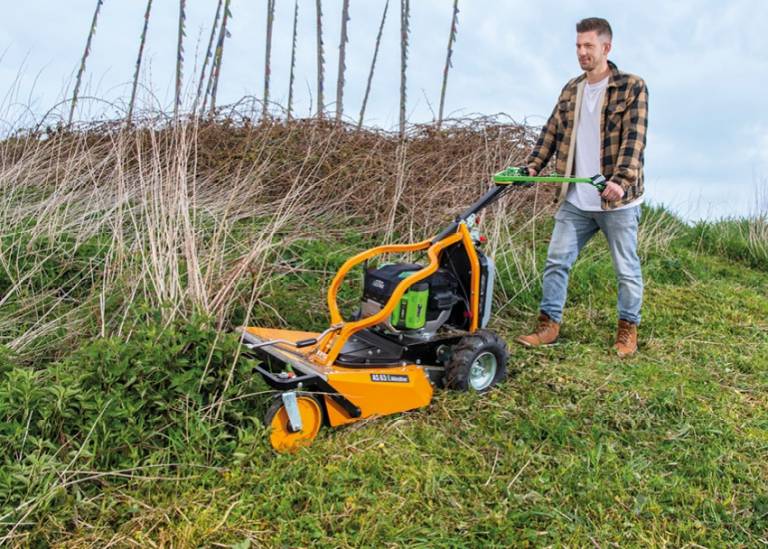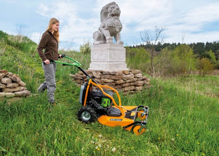 The AS 63 is the slope mower par excellence. With its pneumatic tires and differential lock, it climbs slopes with ease. The engine brake allows it to maintain the selected speed downhill without speeding up. Equipped with a cross-blade system, the AS 63 E-Allmäher easily cuts and shreds tall grass with light brush up to 100 cm high.
